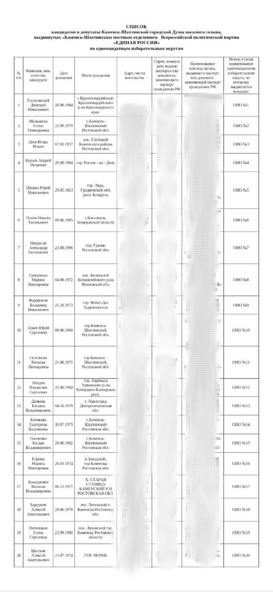 В Каменске-Шахтинском, как и в целом ряде других крупных городов Ростовской области, этой осенью ожидаются выборы в городскую думу. Июль — это время, когда политические партии и кандидаты регистрируются в качестве участников выборов. Все документы об участниках предвыборной кампании по закону территориальные избирательные комиссии обязаны публиковать. Однако речь идет исключительно о ФИО и округе, где баллотируется тот или иной кандидат. При этом подают участники куда больше информации, в том числе и паспортные данные. Вот они и стали достоянием общественности.
