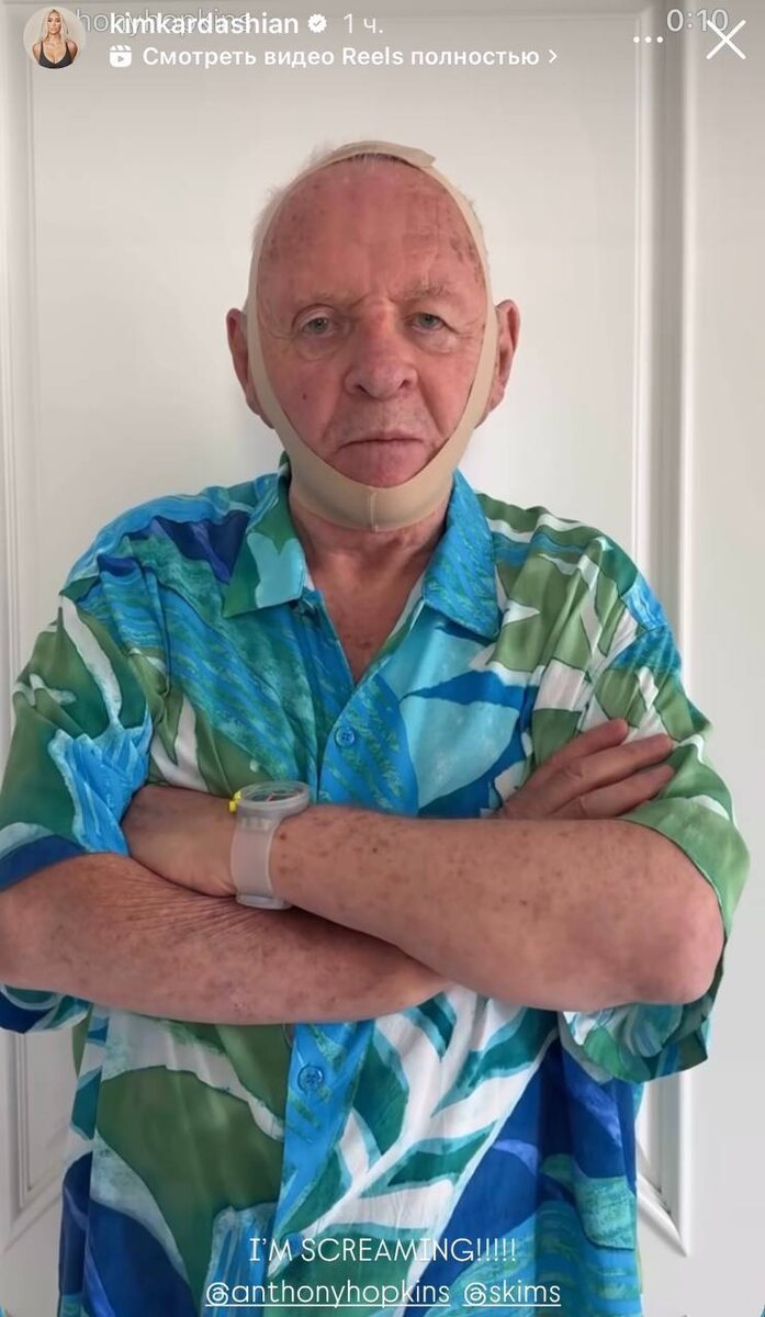 Актер надел новую маску для лица от Skims и сообщил, что чувствует себя на 10 лет моложе. А затем пригласил Ким Кардашьян — создательницу бренда — на ужин в стиле своего героя из «Молчания ягнят» Ганнибала Лектера. Как видим, с самоиронией у Энтони Хопкинса все в порядке.