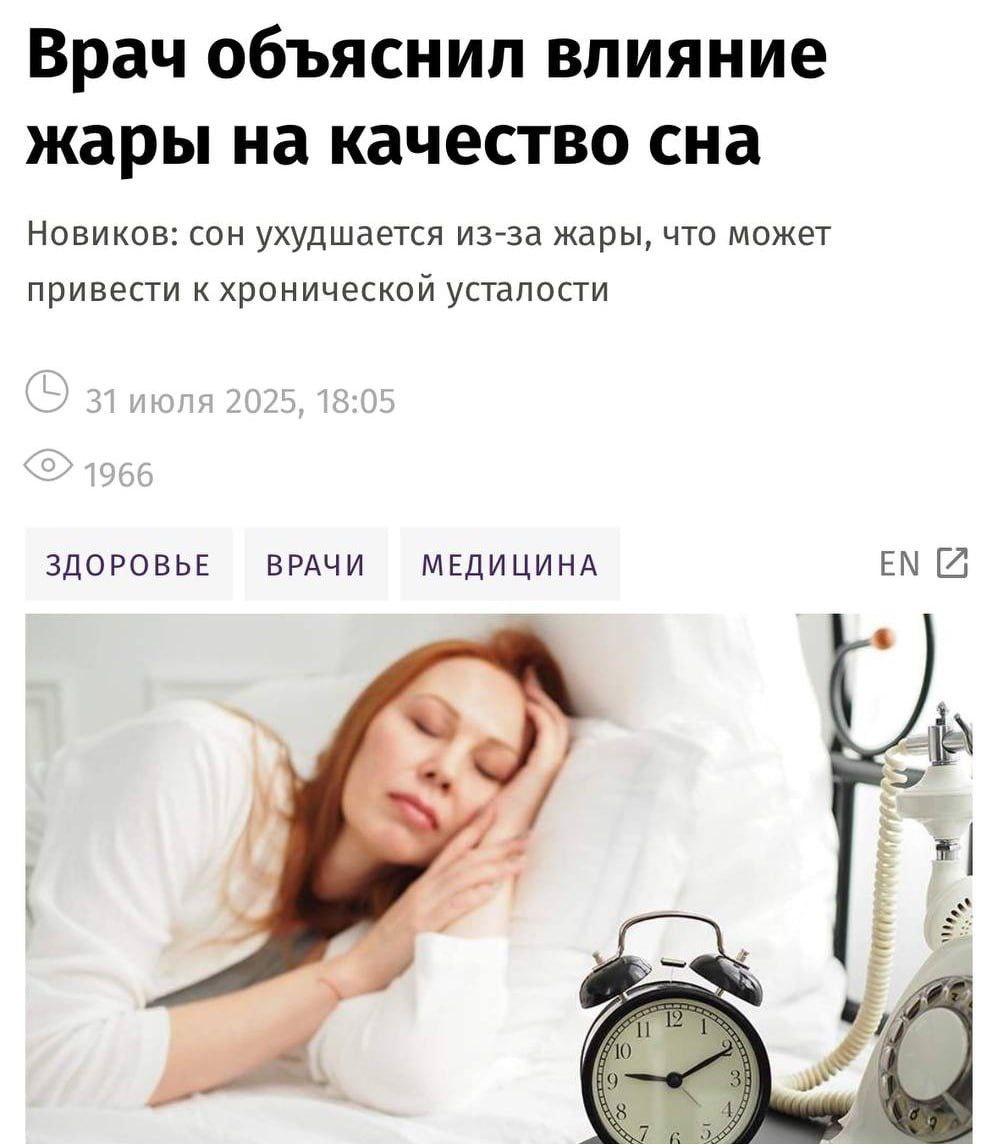 Жара ВЫСАСЫВАЕТ ЭНЕРГИЮ — врачи. Духота каждую ночь уничтожает ваш сон, на утро вы просыпаетесь разбитым и не можете вообще НИЧЕГО. По словам экспертов, когда температура в спальне превышает +26°С — механизм охлаждения организма нарушается, сбиваются фазы глубокого сна, мозг не отдыхает, и от пары недель такого режима у вас просто ОТЪЕДЕТ КУКУХА. Лето, ну за что.
