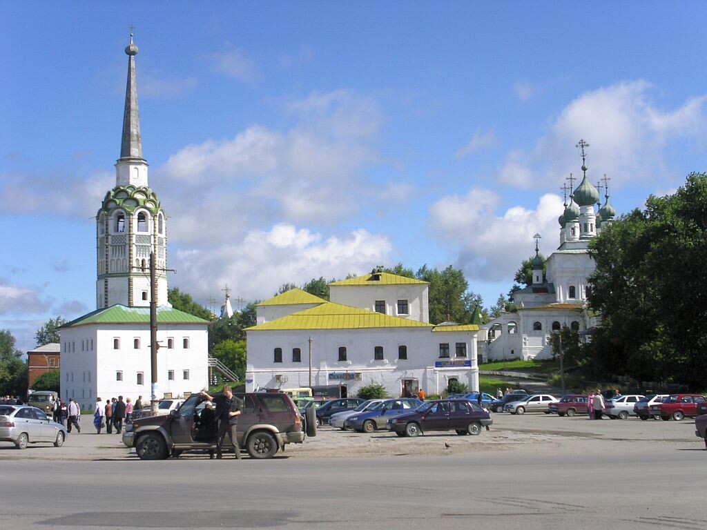По другую сторону от центральной площади стоят еще две красивые, но заброшенные церкви: летняя Спасская и зимняя Архангельская церкви 17-18 вв. Когда-то тут стояла крепость, защищавшая город, а сейчас в одном из зданий городской архив, отчего из закопченных окошек торчат вентиляторы и виднеются корешки пыльных папок, во втором через приоткрытую дверь виднеется какой-то строительный мусор.