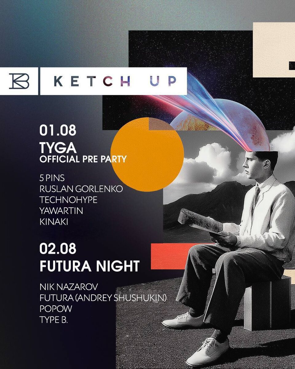 Line up вечеринок в Ketch Up на выходные! 01.08 Tyga official pre party 5 pins Ruslan gorlenko Technohype Yawartin Kinaki 02.08 futura night Nik Nazarov Futura (andrey shushukin) Popow Type B. FC | DC 21+ 🎫 Вход свободный 8 812 444 2 444 🕖 23:00 - 6:00 📍Ketch Up, Москва, Кузнецкий Мост 6/3