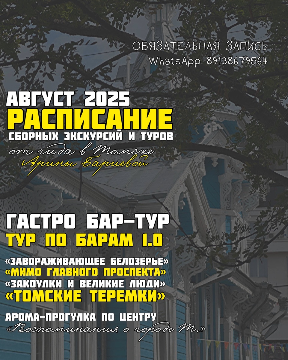 Я - Арина Бариева, гид-экскурсовод в Томске. Приглашаю томичей и гостей города на сборные экскурсии в Томске: Каждая экскурсия и тур могут быть проведены в индивидуальном формате и есть подарочные сертификаты на сумму/тур. Сайт с моими экскурсиями: https://guidetomsk.ru/ *** 8.08 ПТ 19:30 "ЗАВОРАЖИВАЮЩЕЕ БЕЛОЗЕРЬЕ" Экскурсия, которая последнее время очень запала мне в душу. Изучим район полный контрастов: дерево и камень, природа и производство, образование и героические поступки, старые улочки и новые проекты. 1000 вз/400 дет 1.5 ч, пешая *** 9.08 СБ 18:00 ГАСТРО БАР-ТУР Три бара: стильная сидрерия, гастро-бар в старинном доме, питерская-неорюмочная. Дегустация напитков, закуски, изучаем фуд-пэйринг, играем и знакомимся! 2700 р/чел (вкл. закуски, напитки, такси) 2,5 ч, кол-во мест ограничено можно забрать тур под индивидуальное мероприятие *** 15.08 ПТ 19:30 АРОМА-ПРОГУЛКА «ВОСПОМНАНИЯ О ГОРОДЕ Т.» Это наука. И это работает. Мы погрузимся в Феномен Пруста: ароматы, подобранные к зн