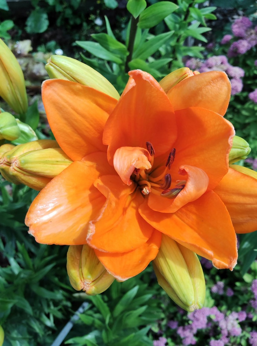 Лилия ЛА-гибрид РОЙЯЛ ТРИНИТИ (начало цветения середина июля 2025 года) Вид на 12.07.2025 года Мощная, здоровая, хорошая лилия, цветущая на протяжении 3 недель. Соцветие держит достаточно долго. Аромата нет. Зацветает одной из первых. Яркое, оранжевое чудо, радующее глаз на протяжении всего цветения независимо от наличия солнца... Дата фотосъемки: 12.07.2025 года 12:37:10 [№1], 12:37:11 [№2] МСК