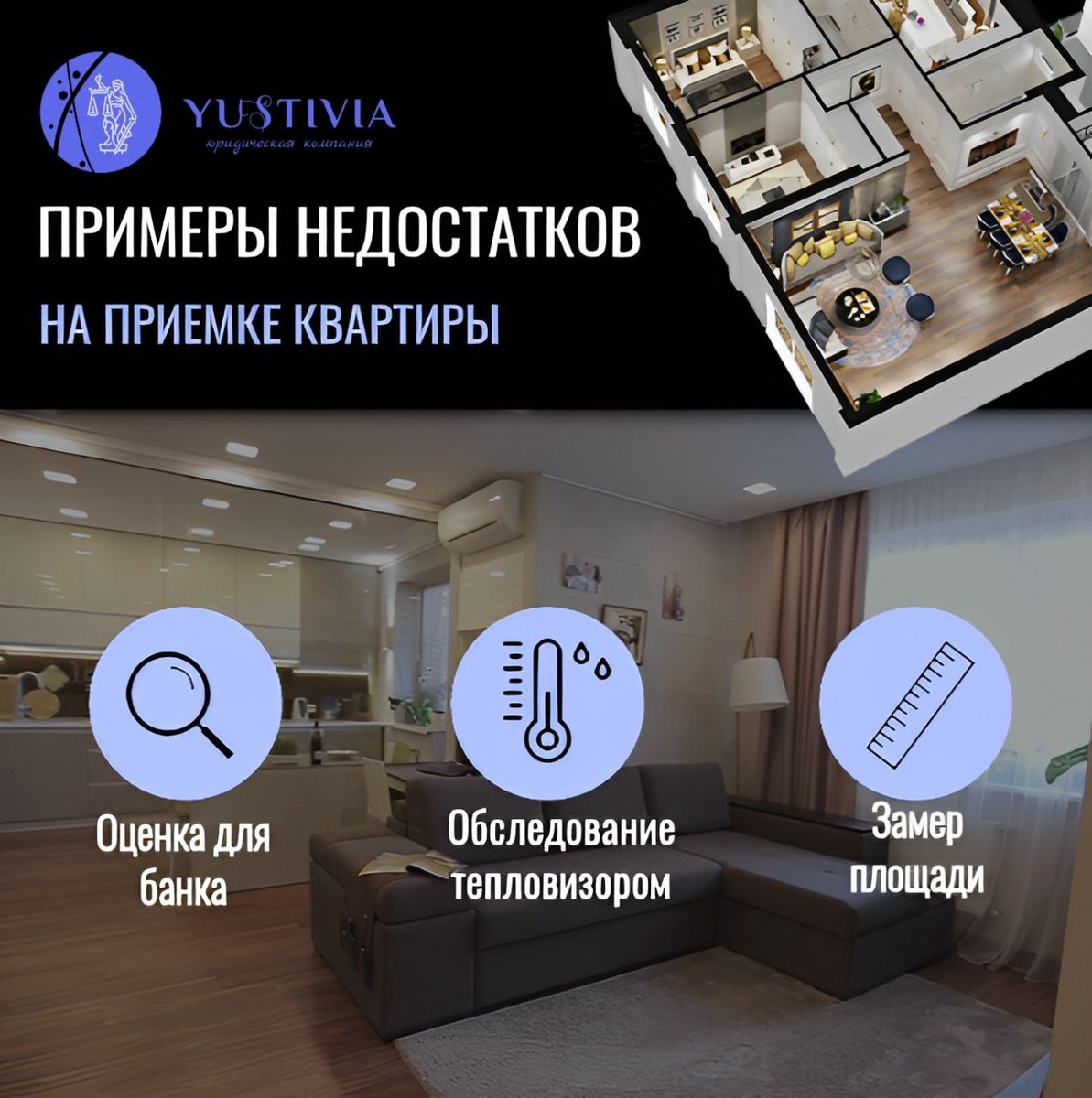 💼Юридическая компания Yustivia предоставляет следующие услуги: ➿➿➿➿➿➿➿➿ Осмотр квартиры приемщиком, включенным в реестр НОПРИЗ/ НОСТРОЙ: ➡️Визуально-инструментальная проверка объекта недвижимости строительным экспертом с целью выявления допущенных застройщиком нарушений в процессе строительства и отделочных работ. (Предъявление застройщику всех дефектов возлагает на него обязанность устранить выявленные замечания в течение 60 календарных дней в соответствии с законодательством). Оценка для банка: ➡️Независимая оценка недвижимости - обязательное требование Федерального закона "Об ипотеке (залоге недвижимости)", необходима для оформления закладной. (Осуществление оценки обеспечивает исполнение заемщиком обязательств по кредитному договору, а также формирует сведения о рыночной стоимости объекта в случае нарушения условий ипотечного договора со стороны должника). Обследование тепловизором: ➡️Выявление теплопотерь и дефектов теплоизоляции для повышения энергоэффективности вашего жил