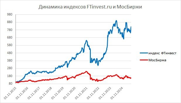❕За прошедшую торговую неделю наш российский 🇷🇺 портфель – индекс ФТинвест вырос на 3,58% до 823,267 пунктов, за этот же период времени индекс МосБиржи снизился на 1,62% до уровня 2727,98, таким образом альфа нашего портфеля с 1 ноября 2015 составляет 667,794%, а с начала 2025 наше преимущество над бенчмарком равно -5,31 (индекс МосБиржи) – (+5,21) (индекс ФТинвест) = 10,52%.
