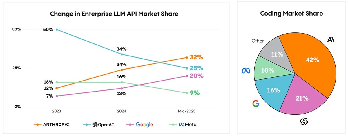 За два года Anthropic обогнала OpenAI по числу пользователей среди программистов и корпоративных клиентов в США. Её моделями пользуются 32% предприятий и 42% разработчиков, по данным Menlo Venture. В 2023 году OpenAI занимала 50% рынка ИИ-моделей для бизнеса, а теперь 25% vc.ru/ai/2134066