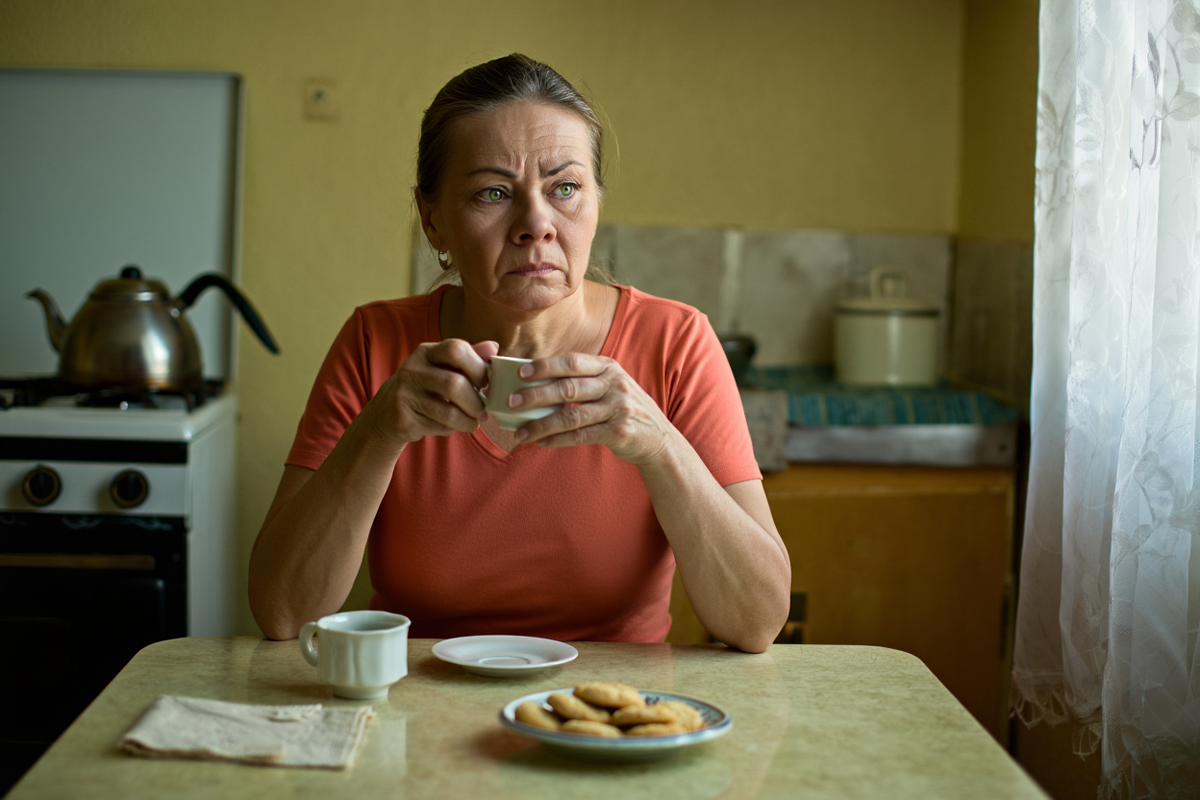 Света хлопнула дверью, оставив Ольгу одну с тяжёлыми мыслями. На кухне стояли недопитые чашки чая, лежало нетронутое печенье. Ольга опустилась на стул и заплакала.