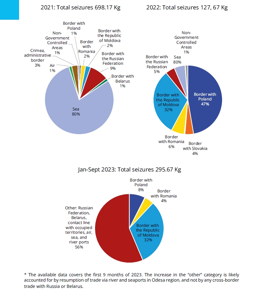 Перед полномасштабным вторжением Росси в феврале 2022 года основными точками ввоза наркотиков в Украину были порт Одессы и аэропорт Борисполь. Через них шли поставки как элитного кокаина из Латинской Америки, так и героина из Афганистана, доставляемого транзитом через Центральную Азию и Южный Кавказ. Однако боевые действия радикально изменили логистику: перекрытые морские и воздушные маршруты, разрушенная инфраструктура и потеря контроля над частью территории вынудили преступные группы искать новые пути Согласно данным Министерства внутренних дел и Госпогранслужбы Украины, уже в 2022 году наметился рост объёмов контрабанды через западные сухопутные границы — прежде всего с Польшей, Молдовой и Приднестровьем. Если в пандемийном 2021 году почти 80% изъятий приходилось на морские поставки, то в условиях войны на первый план вышли наземные перевозки. В последнем квартале 2022 года статистика показала «откат» к прежним объёмам, что может говорить о восстановлении логистики криминальных груп