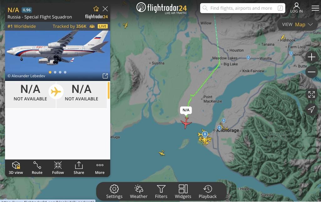 По данным FlightRadar24, за снижением борта в небе над Анкориджем, на котором находится Владимир Путин, следят более 350 000 человек.