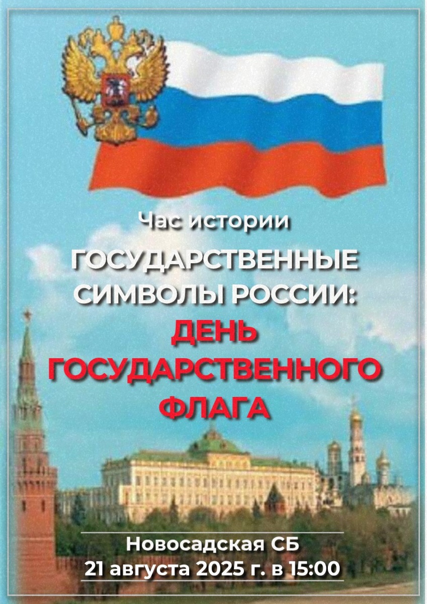 📣Анонс. Час истории «Государственные символы России: День государственного флага»🇷🇺 Дорогие друзья! Приглашаем вас 21 августа 2025 года с 15:00 до 16:00 в Новосадскую сельскую библиотеку на увлекательный час истории, посвященный Дню государственного флага Российской Федерации! Каждый год 22 августа мы отмечаем этот важный праздник, который является данью уважения к нашей великой истории и традициям. Трехцветный стяг России олицетворяет не только военные победы и достижения, но и крепость духа нашего народа. На мероприятии заведующая библиотекой С.Э. Кушу поделится историей создания российского флага и расскажет о значении его цветов. Вы также узнаете, в каких случаях поднимается флаг нашей страны, и получите уникальную информацию о других государственных символах. Не упустите возможность присоединиться к нам и вместе вспомнить о гордости за свою Родину – крепкую и дружную державу!