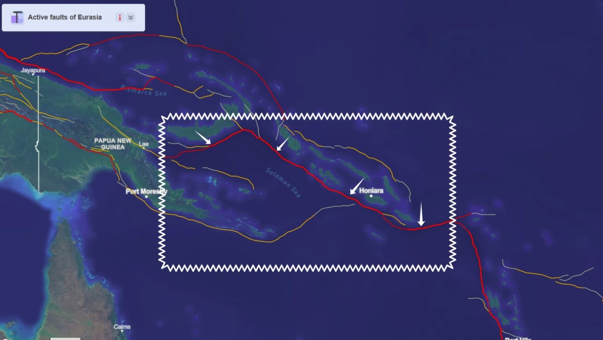 На уровне М7+ дегазируется рифтовая зона от Новой Британии до южной оконечности Соломоновых островов