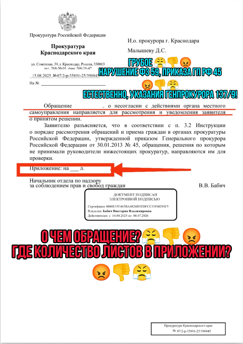 Сегодня, 15 августа 2025 года, мне на электронную почту приходит очередная, уже ТРИНАДЦАТАЯ (если не больше!) по счёту, абсолютно аналогичная отписка за №07/2-р-35891-25/390845, в которой Бабич В.В., вопреки прямому запрету ч.6 ст.10 ФЗ-59, п.2.3 Приказа ГП РФ №45 и Вашего же(!) указания №137/9, вновь незаконно перенаправила мою жалобу тем самым должностным лицам, действия которых я обжалую!