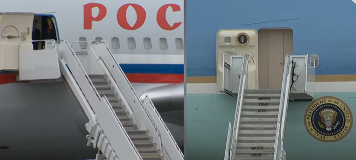 Самолет Трампа приземлился раньше. Но сам американский президент долго не покидал салон своего лайнера. Пауза затянулась. Я прочитала у американцев, что к нему на борт поднялись сенаторы от штата Аляска, в том числе не очень симпатизирующая Трампу сенаторша Лиза Мурковски. Губернатор штата Майк Данливи тоже зашел поздороваться. В телеге друзья предположили, что Лиза связала Трампу шнурки, чтоб он не мог спуститься по трапу. Европейцы тем временем подняли страшный шум по поводу красной дорожки - мол, не сможем мы такое пережить. Самолет президента России приземлился. А Дональда всё нет. Но оказалось, что первое рукопожатие было задумано очень красиво и необычно. И чтоб никому обидно не было. Все на равных. Президенты пошли навстречу другу. Настроение у обоих отличное. Постояли немножко на радость фотокорам. Не ответили ни на один вопрос. Пошли себе спокойно в сторону кортежа. И - аааааааааа.... Сели в один автомобиль. К американскому президенту. Вот сюда. И уехали. Пойду я посмотрю,