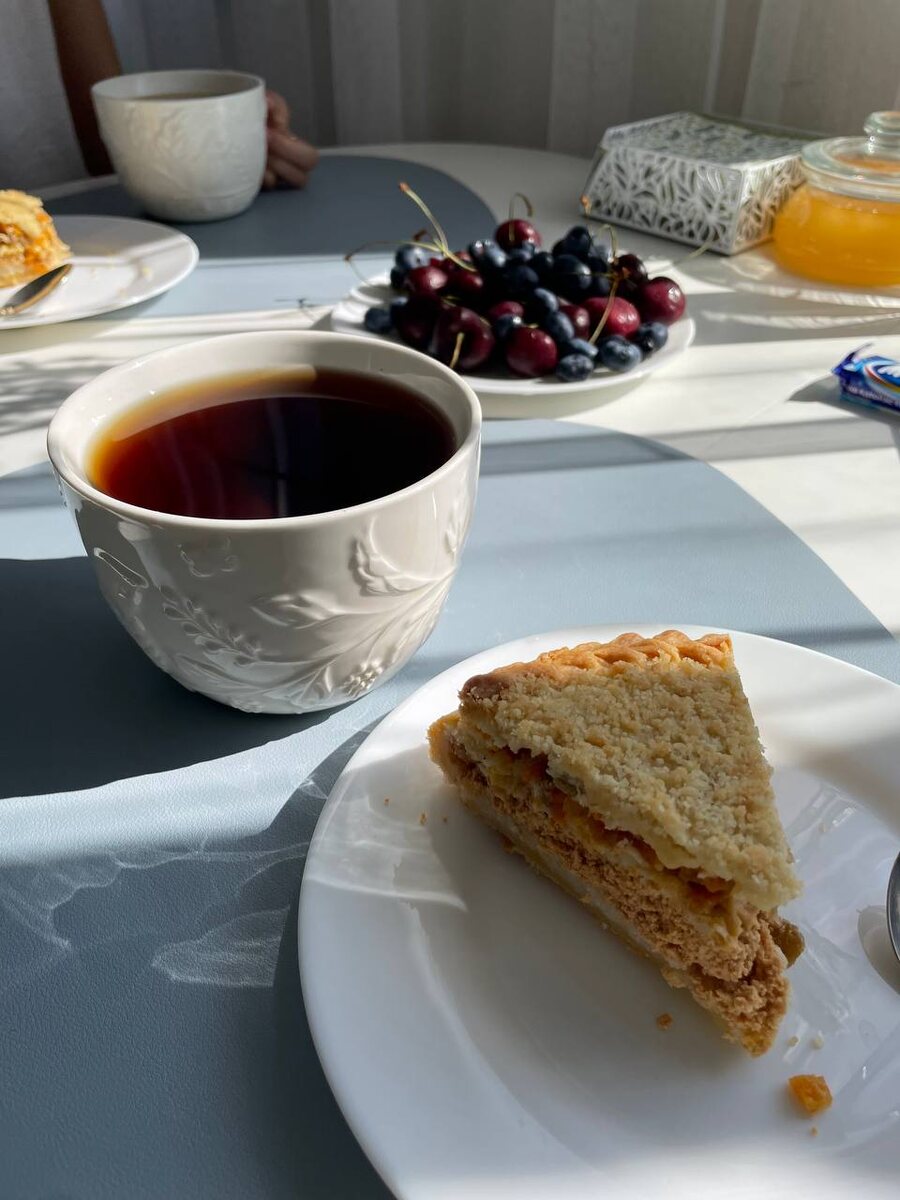 Сегодня: на завтрак губадия, черешня, голубика; на обед омлет из 2х яиц с картофелем, томатом и сыром; позже капучино с тортиком; на ужин паста с сырным соусом и лимонад