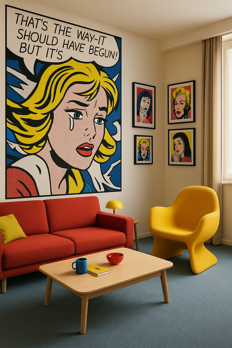 Поп-арт — это стиль, который невозможно спутать ни с чем. Яркие цвета, дерзкие образы, юмор и цитаты из массовой культуры — всё это делает интерьер живым и эмоциональным. Он словно говорит: «Не относись к жизни слишком серьёзно — играй, пробуй, будь смелее». Впервые он появился в 50–60-х годах в Лондоне и Нью-Йорке как протест против элитарного искусства. Художники начали вдохновляться не музеями, а рекламными плакатами, упаковками продуктов и комиксами. Именно поэтому поп-арт всегда был ближе к людям — он понятный, узнаваемый и яркий. В последние годы минимализм и спокойные интерьеры заняли Instagram и Pinterest. Но у многих возникла усталость от бесконечных бежевых стен и одинаковых «уютных» диванов. На смену этой тишине приходит цвет, смелость и индивидуальность. Поп-арт идеально вписывается в эту тенденцию. Он помогает выразить себя, добавить в дом эмоции и показать, что интерьер — это не просто фон, а продолжение вашей личности. Чтобы «прочитать» поп-арт в интерьере, достаточно за