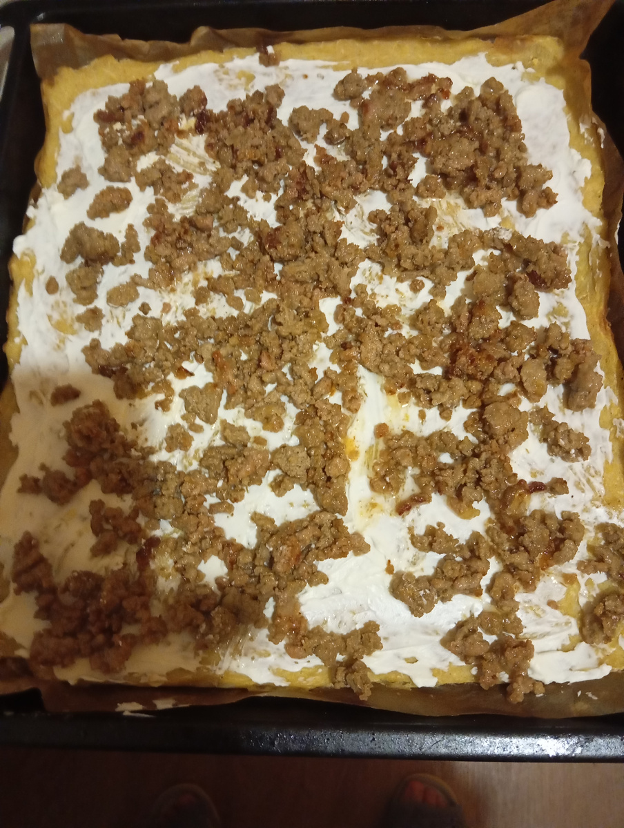 Здравствуйте, начинается сезон огромного количества кабачков и все и всюду их отдают и вот у меня появились два кабачка, не больших и мне подруга посоветовала приготовить рулет. Ингредиенты: 2 кабачка примерно 1 кг 2 яйца Специи Мука примерно 10 ст.л. Измельчаем на тёрке или шинковке почищенные кабачки и отжимаем их в другую миску от жидкости. Добавляем, яйца, специи и муку (возможно потребуется больше или меньше), смесь должна быть не жидкая. Противень застелить пергаментом и вылить смесь и распределить по всей поверхности и поставить в разогретую до 180° духовку на 40 минут, смотрите по готовности. Для начинки: Творожный сыр 120 гр Фарш 400 гр Помидор 1-2 шт Специи Лук Обжариваем фарш с луком до готовности. Как основа немного остыла прям на противне обмазываем ее творожным сыром, сверху выкладываем фарш и в хаотичном порядке порезанные дольками помидоры. Потом закручиваем плотно в рулет потихоньку снимая бумагу и убираем хотя бы на пол часа в холодильник. Есть можно, как в