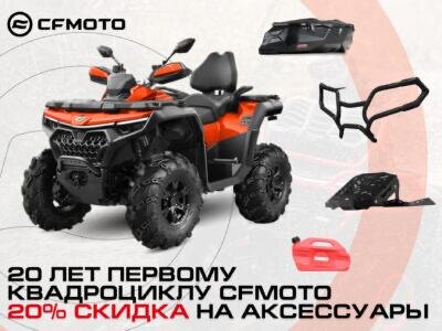 В честь 20-летнего юбилея первого квадроцикла CFMOTO мы дарим скидку 20% на все оригинальные аксессуары и дополнительное оборудование* при покупке любых моделей новых квадроциклов ATV и мотовездеходов Side-by-Side CFMOTO!