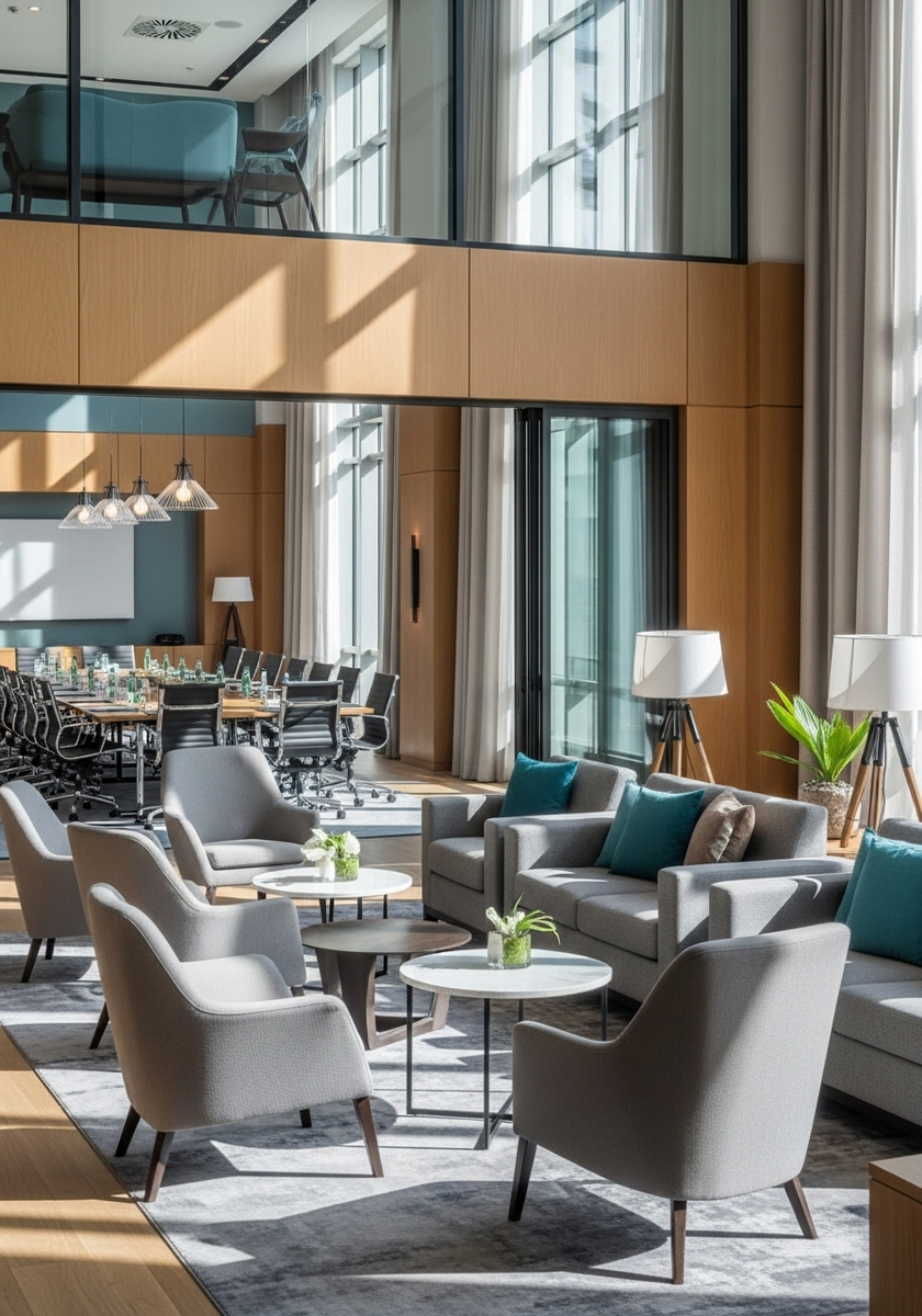 Для деловых мероприятий предусмотрено несколько залов, включая просторный конференц-зал площадью 250 кв.м с высоким потолком и дневным освещением, а также переговорные комнаты различной вместимости. Уникальной особенностью является наличие трех спортивных арен для проведения мероприятий до 1000 гостей.