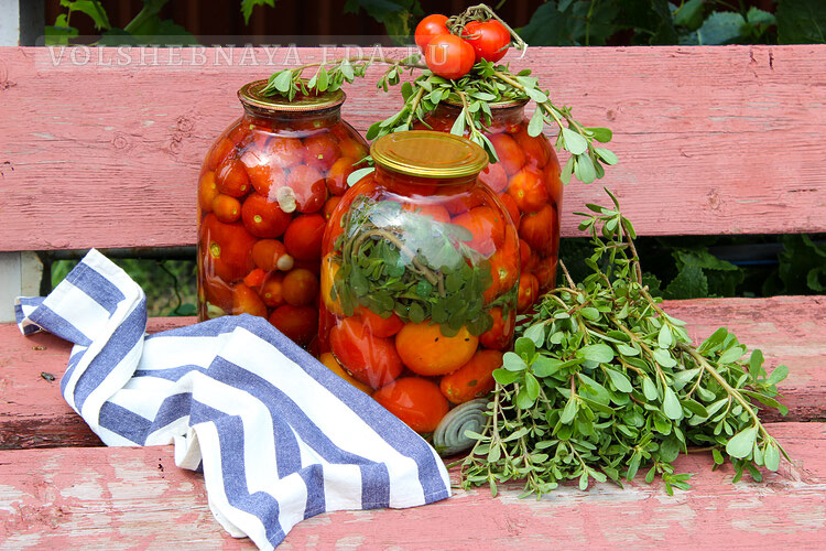 В кулинарии огородный портулак используют в пищу как в сыром виде, так и после термической обработки (вареный, соленый или маринованный). Предлагаю простой рецепт очень вкусной заготовки — маринованные помидоры с портулаком. Зимой, когда откроете банку, первым съедите портулак! Помидорки будут очень вкусными, кисло-сладкими, да и рассол тоже можно выпить. Мариновать помидоры с портулаком удобнее всего в 3-литровых банках, поэтому все пропорции в рецепте приведены на этот литраж. Рецепт без стерилизации, методом двойной заливки кипятком (в третий раз заливаем маринадом с уксусом, солью и сахаром). Общее время: 24 часа | Время приготовления: 60 минут Выход: 3 л | Калорийность: 17 кКал на 100 г на 3-литровую банку: Отобрать крепкие помидоры (сорт сливка и тому подобные, с плотной кожицей), помыть, дать стечь воде, Большой пучок портулака тщательно помыть, чтобы не было частичек песка. Банки объемом 3 литра помыть с содой, стерилизовать не обязательно. На дно уложить зонтики укропа, ч