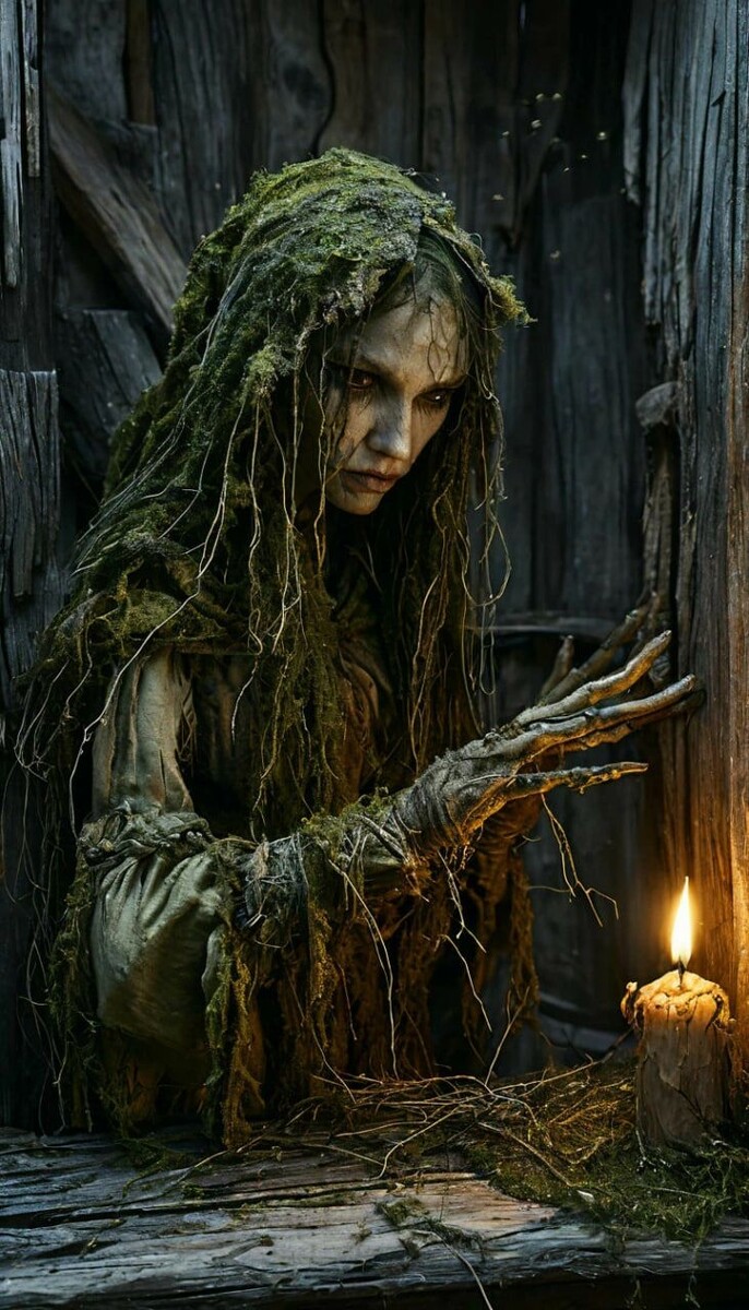 Её лицо было бледным, как у трупа, с синюшными прожилками под кожей. Губы – тонкие, почти чёрные, растянутые в вечной гримасе, будто ей постоянно приходится улыбаться. Глаза – мутные, с серой пеленой, но в глубине мерцал холодный, безжалостный разум.