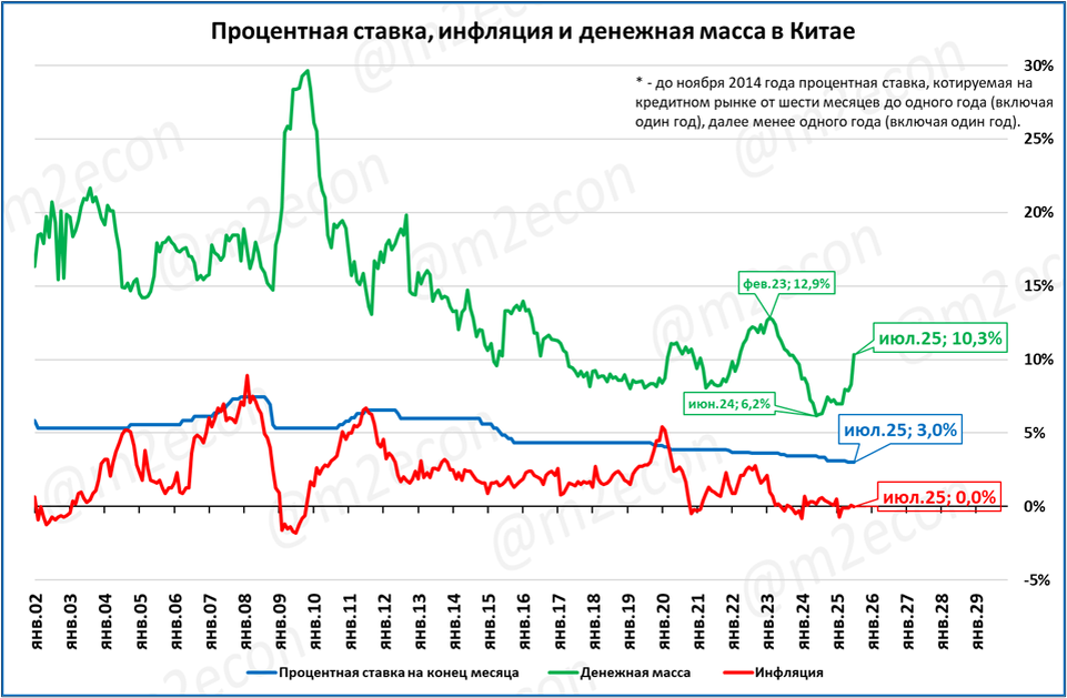 В июле рост денежной массы М2 в Китае составил 10,3% годовых. Рост реальной денежной массы (РДМ) равен росту номинальной и составил 10,3% за год, так как инфляция за июль составила 0,0 %. Как видно на графике, РДМ впервые с 2023 года растёт темпом более 10%. До этого в течение трёх месяцев рост держался на уровне +8%. Ускорение роста РДМ, несомненно, позитивно скажется на китайской экономике. Напомним, что ВВП Китая во 2 квартале вырос на 5,2%. Это чуть ниже темпов первого квартала (5,4%), но выше цели, поставленной партией на 2025 год (5%). МВФ пересмотрел свои оценки роста ВВП Китая в 2025 году с 4,6 до 4,8%. Несмотря на этот пересмотр, прогноз предполагает, что после роста на 5% в 2024 году рост ВВП замедлится до +4,8% в 2025. Оценка и прогноз Мы наблюдаем: Учитывая эти факторы и индикаторы, мы не ожидаем замедления китайской экономики. Поэтому прогноз МВФ, по нашей оценке, излишне пессимистичен. === Телеграм: @m2econ Навигатор: https://dzen.ru/a/ZPyf34uBfzz9x0pr