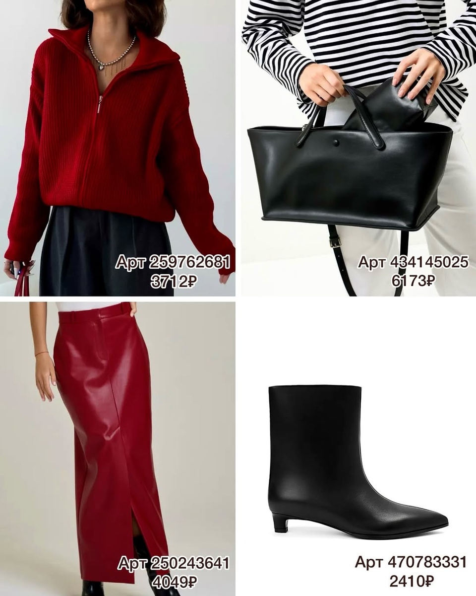 - Сумки-акценты: чёрный тоут (арт. 434145025), плетёная шоколад (арт. 273397587), винная багет (арт. 289477635), оливковый хобо (арт. 328165705), карамельный кроссбоди (арт. 316447463).
