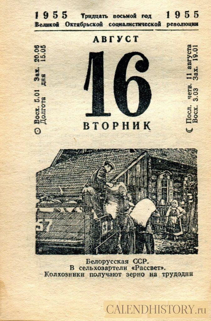 Итак, сегодня 16-августа и у нас на календаре 1955-й год. Перед нами листок советского календаря Политиздата. На календаре у нас вторник - 16 августа 1955-го года. Белорусская ССР.