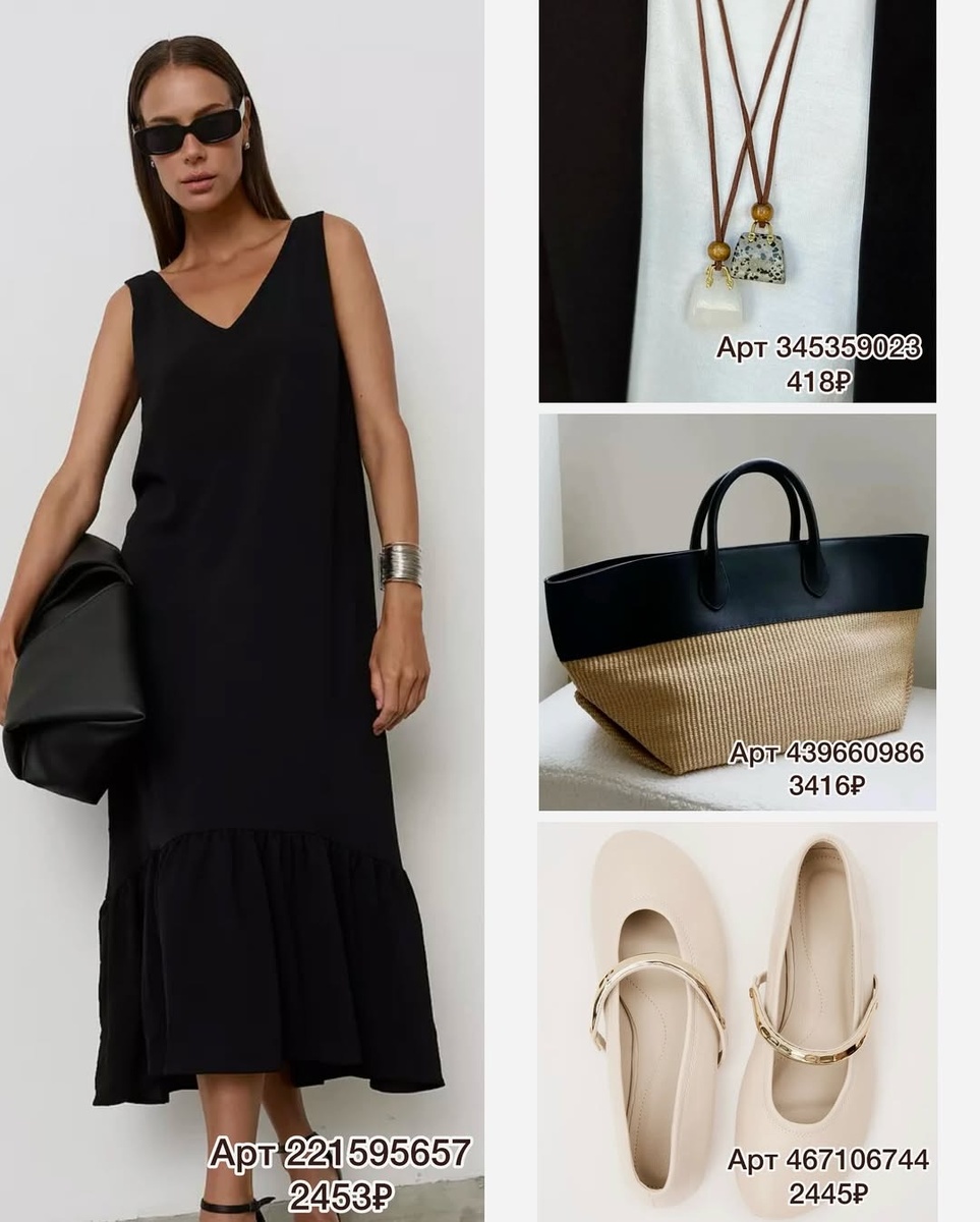 - Кремовый костюм + соломенный тоут + бежевые mary-jane (арт. 464724588, 439660986, 467106744) — чистая эстетика quiet luxury.