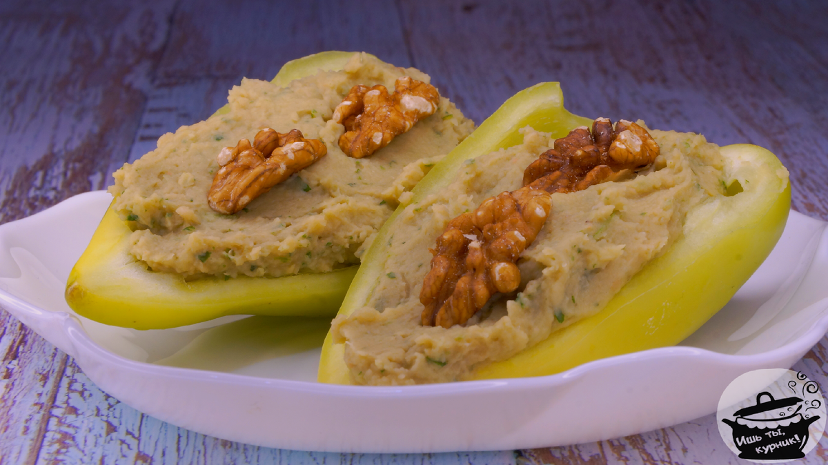 Ингредиенты: перец болгарский- 2 шт.; фасоль - 1 банка; зелень- небольшой пучок; грецкие орехи - 1/2 ст.; чеснок - 1 зубчик. Приготовление: фасоль промыть, слить. Зелень и чеснок измельчить, перец разрезать на лодочки, удалив ножку и семена. Перебить погружным блендером до однородной массы фасоль, зелень, чеснок, орехи. Полученной пастой начинить лодочки перца, украсить грецким орехом. Приятного аппетита!