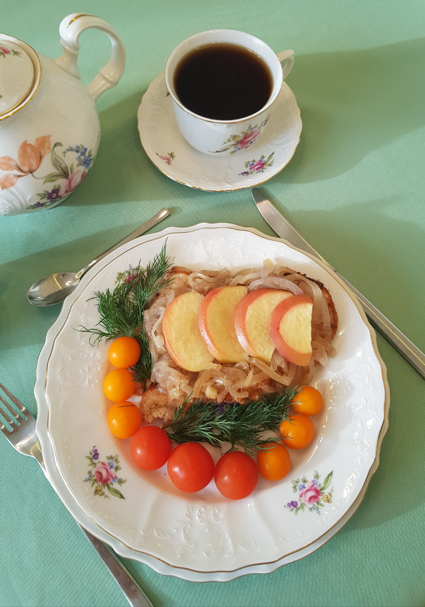 Добрый день, дорогие друзья! Сегодня я приглашаю вас на рождественскую прогулку в Данию, чтобы насладиться ароматным, насыщенным блюдом из свинины, яблок и лука. Æbleflæsk [ˈeːpləˌflesk] переводится как яблочная свинина, это блюдо имеет множество вариантов приготовления и пользуется наибольшей популярностью на острове Фюн. Для приготовления нам понадобятся: 1,8 килограмма стейков из свиной корейки, 800 грамм красного лука, 300 грамм яблок, 4 большие веточки розмарина, 2,5 чайные ложки соли, 1 столовая ложка коричневого сахара, 1 чайная ложка чёрного молотого перца, 3 столовые ложки подсолнечного масла. Приготовление: стейки отбить с обоих сторон сначала стороной молотка зубчатой, потом плоской. Чтобы не летели брызги от мяса, перед отбиванием поместить каждый кусочек мяса в полиэтиленовый пакет или накрыть стейк перед отбиванием полиэтиленовой пленкой. Смазать мясо 1 столовой ложкой растительного масла со всех сторон. Выложить стейки на разогретую сковороду с 1 столовой ложкой расти