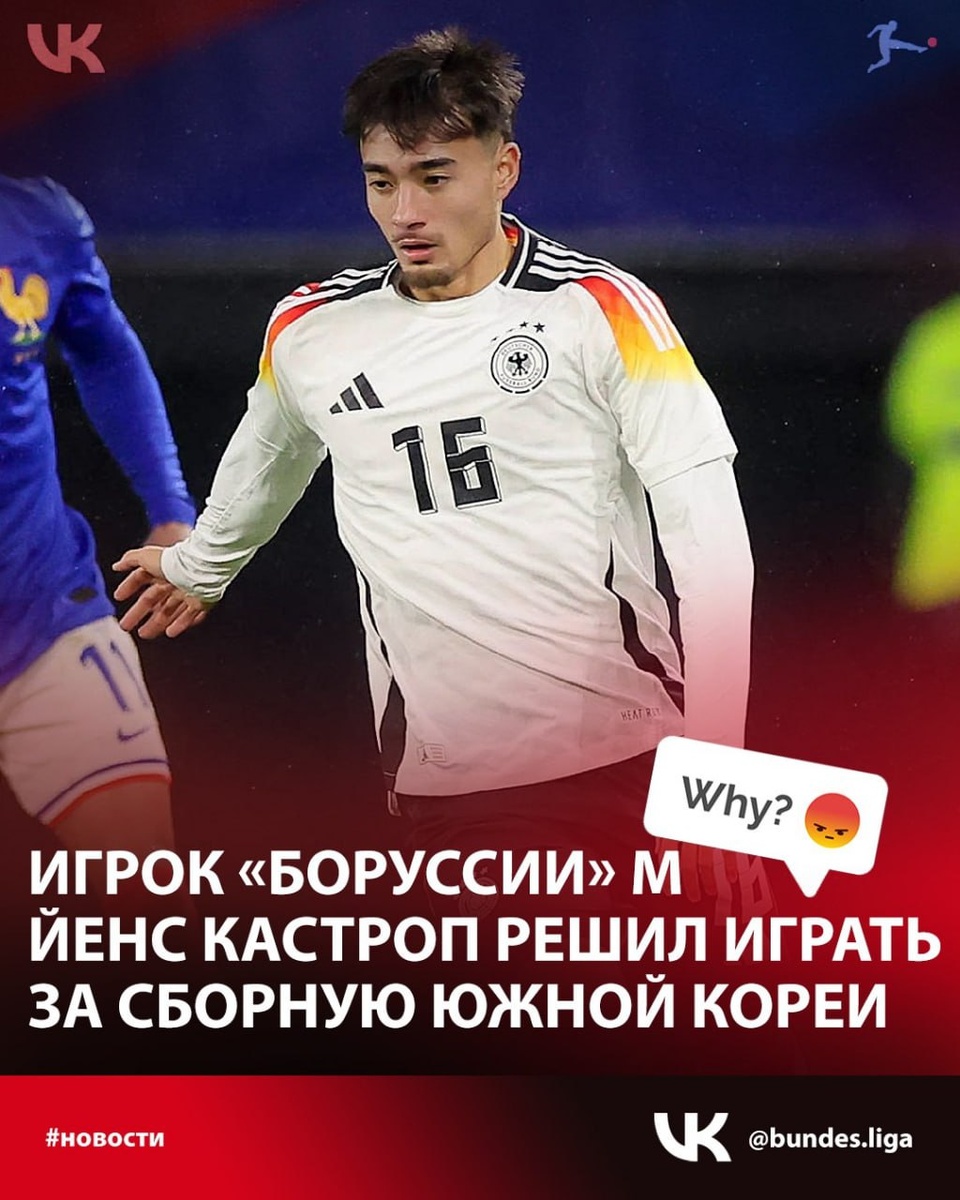 🇩🇪🚫 🇰🇷✅ Йенс Кастроп официально сменил футбольную сборную Германии на сборную Южной Кореи, что лишает его права выступать за сборную Германии на всех будущих соревнованиях. 💯 ФИФА официально подтвердила этот переход на своей платформе смены ассоциации в начале этой недели. Йенс родился в Дюссельдорфе в семье отца-немца и матери-кореянки. 22-летний полузащитник, недавно перешедший в менхенгладбахскую "Боруссию" из 1. ФК "Нюрнберг" выступал за сборную Германии на всех молодежных международных уровнях, от национальных сборных до 16 лет. ⚡️ Корейские СМИ начали сообщать об интересе Кастропа к сборной Южной Кореи ещё в январе, когда его личный тренер подтвердил, что Кастроп хочет выступать за «Тэгеук Уорриорз» Примерно в то же время стало известно, что Корейская футбольная ассоциация и руководство национальной сборной, в частности Хон Мён Бо, связались с Кастропом по поводу его желания выступать за Южную Корею. Его мать, ещё в марте дала интервью корейским СМИ, в котором сказал