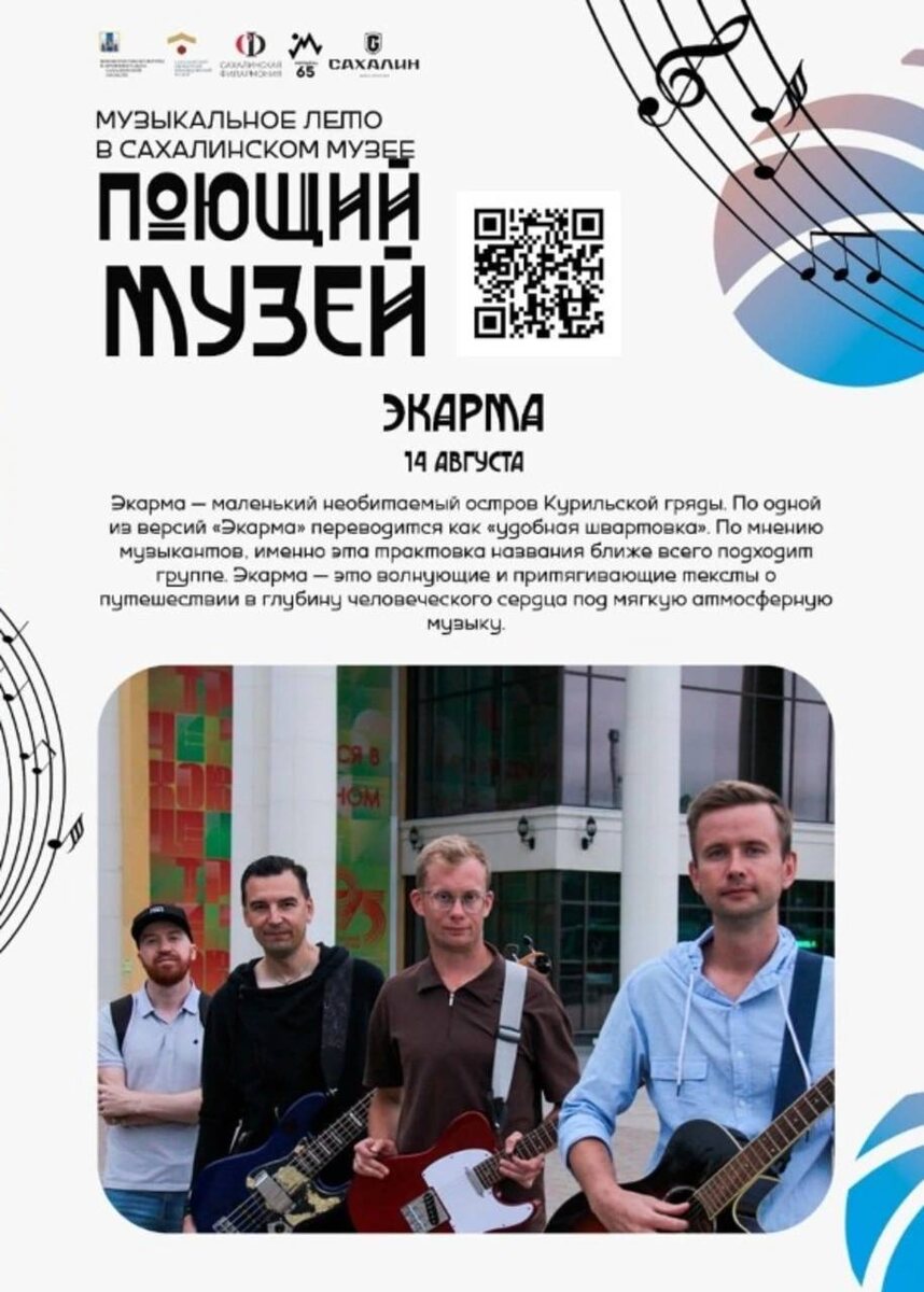 🗾 В рамках фестиваля «Поющий музей» в областной столице выступит сахалинская группа «Экарма» ✨ Музыкальный концерт состоится уже сегодня, 14 августа, в 19:00 на территории Сахалинского областного краеведческого музея (г. Южно-Сахалинск, Коммунистический проспект, 29). Также в программе фестиваля: ➡️ ярмарка и гастрономические точки (с 12:00) ➡️ выступление сахалинской поэтессы и певицы Виктории Крыловой ➡️ фолк-музыка от дуэта «Воронья стража» в составе Кирилла Усманова и Алексея Осипова 🎙 Традиционно ведущей программы станет солистка Сахалинской филармонии, телеведущая канала «ОТВ Сахалин» и «Мисс Романсиада Дальний Восток» Ярославна Калашникова. ‼️ Сегодня экспозиции музея и территория будут доступны для посещения до 21:00. 📎 Также на фестивале «Поющий музей» будет организована выставка-продажа картин сахалинских художников. Это стало возможным благодаря стратегическому проекту губернатора Валерия Лимаренко «Художники Сахалинской области».