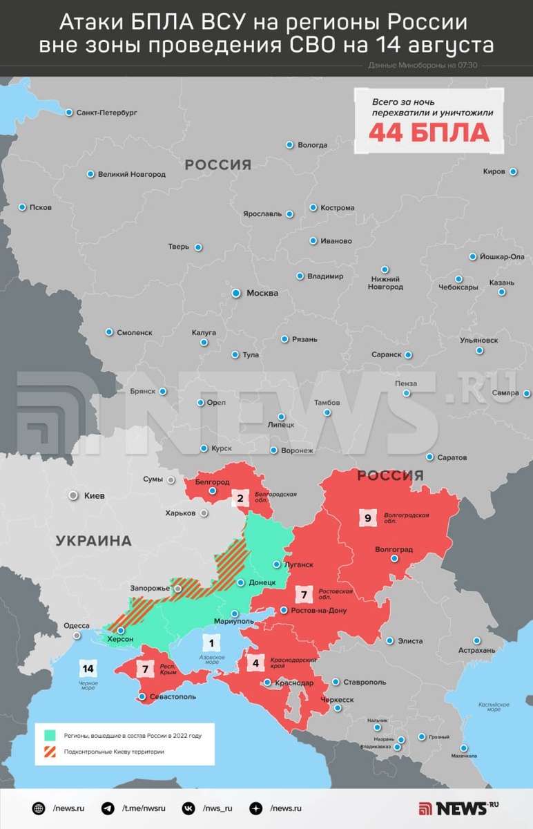 Больше всего дронов нейтрализовали над акваторией Черного моря —14. БПЛА также уничтожили в Волгоградской, Ростовской и Белгородской областях, в Краснодарском крае, Крыму и над акваторией Азовского моря.