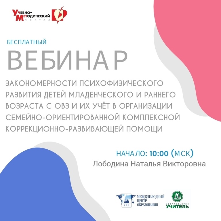 Международный вебинар «Закономерности психофизического развития детей младенческого и раннего возраста с ОВЗ и их учёт в организации семейно-ориентированной комплексной коррекционно-развивающей помощи» Дата проведения: 15.08.2025 Начало: 10:00 (МСК) https://www.uchmet.ru/events/item/3914785/ На вебинаре слушатели вместе с ведущим познакомятся с закономерностями психофизического развития детей младенческого и раннего возраста с ОВЗ и их учёт в организации семейно-ориентированной комплексной коррекционно-развивающей помощи. На вебинаре будут рассмотрены следующие ВОПРОСЫ: - Подходы к разработке индивидуальной образовательной программы в системе ранней помощи детям с ОВЗ. - Клинико-психолого-педагогическая характеристика детей раннего и младшего дошкольного возраста с ОВЗ. - Система ранней помощи детям с ОВЗ. - Календарь развития ребенка. - Признаки неблагополучия в развитии ребенка. - Принципы, задачи и содержание коррекционно-развивающей работы с детьми первых лет жизни. - Содержание