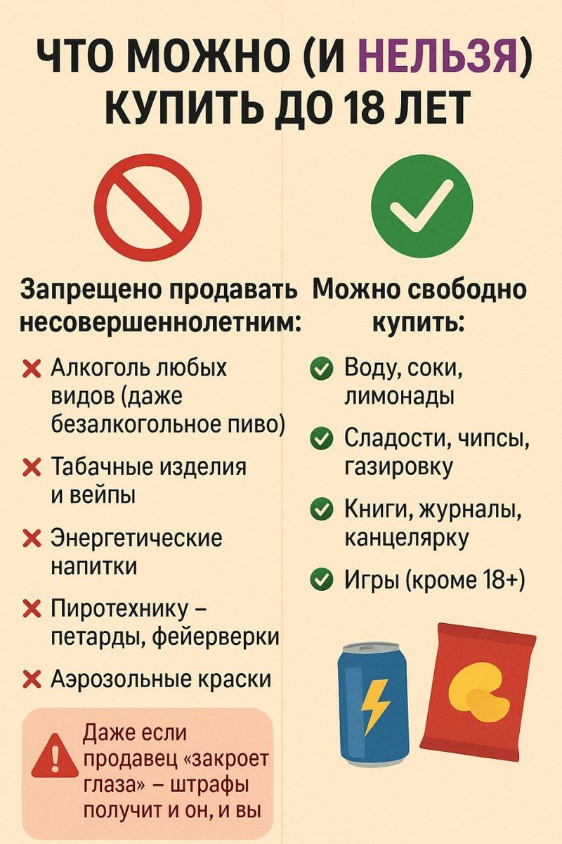 🛒 Что можно (и нельзя) купить до 18 лет? Запрещено продавать несовершеннолетним: ❌ алкоголь любых видов (даже безалкогольное пиво); ❌ табачные изделия и вейпы; ❌ энергетические напитки (во многих регионах); ❌ пиротехнику — петарды, фейерверки; ❌ аэрозольные краски (в ряде регионов). ☝🏻Даже если продавец «закроет глаза» — штрафы получит и он, и вы (через родителей). Можно свободно купить: ✅ воду, соки, лимонады; ✅ сладости, чипсы, газировку; ✅ книги, журналы, канцелярку; ✅ игры (кроме 18+). ❓Знали про это? 👍🏻 — Да, всё знаем 🙏🏻 — Частично 🔥 — Нет, спасибо за инфу Школы России → подписаться Больше информации в нашей группе, переходите