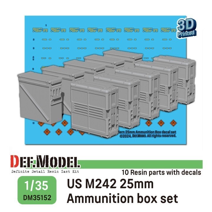 Южнокорейская DEF Model выпустила на 3D-принтере модели американских патронных коробов и стреляных гильз: US M242 25mm Ammunition box set /w Decal (каталожный номер DM35152) US XM813 30X173mm cannon Cartridges Case set (DM35155)