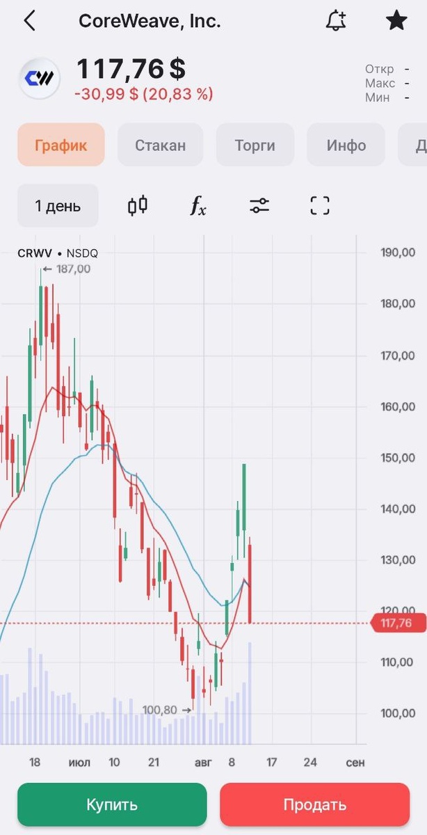 Минус 20% за день. Вчера отчитался конкурент Небиуса. Инвесторы расстроились. Что удивило меня на поверхности. Рентабельность. Лезть в отчеты лень, но пишут, что рентабельность скатилась до 2%. Такую рентабельность очень не интересно иметь. Первый же вопрос, есть ли такой риск у Небиуса. 🤔 Вообще, интересно как дальше будут вести себя акции, так как сегодня заканчивается локап период. Те, к о брали на IPO - смогут продать. Локап-период CoreWeave после IPO заканчивается 14 августа 2025 года. Это означает, что начиная с этого дня инсайдеры и крупные акционеры компании смогут свободно продавать свои акции на рынке. Обычно локап длится около 180 дней, но у CoreWeave он заканчивается уже на следующий день после публикации финансового отчета за второй квартал 2025 года .