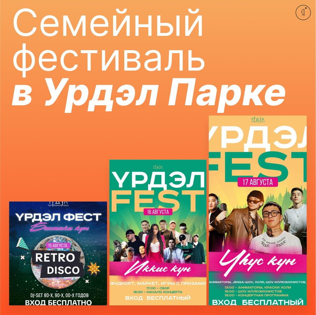 Семейный фестиваль "Урдэл Фест" #Загородом 🤩 ПЯТНИЦА, 15 августа Танцевальный марафон под открытым небом - DJ-сеты с лучшими хитами 80-х, 90-х и 00-х - Фуд-корт (работает до 00:00) 🤩 Бесплатный вход для всей семьи 🤩 СУББОТА, 16 августа Мегазвёздный концерт Выступают: - Байбал, Лэкиэс, Понсаш & Фиеста, Маахта, Кэскил Баишев - Алексей Филиппов, Паша Бояркина, ASPECT, AZARCHIK - ОРЛОВ, ВТОРОВСКИЙ, LIVE MUSIC YKT, MELTSAY 🤩ВОСКРЕСЕНЬЕ, 17 августа Детский праздник - яркий финал фестиваля - 13:00 - Аниматоры и игры - 13:00 - Фестиваль красок Холи - 15:00 - Шоу иллюзионистов - 16:00 - Концерт с участием: • Эрхаан • Серж • Китджа • Анхааров 🤩 15 августа (пт) - танцы с вечера 🤩 16 августа (сб) - сбор с 17:00, начало в 18:30 🤩 17 августа (вс) - сбор с 12:00 🤩Урдэл Парк Вход свободный Online Якутия | Подписаться