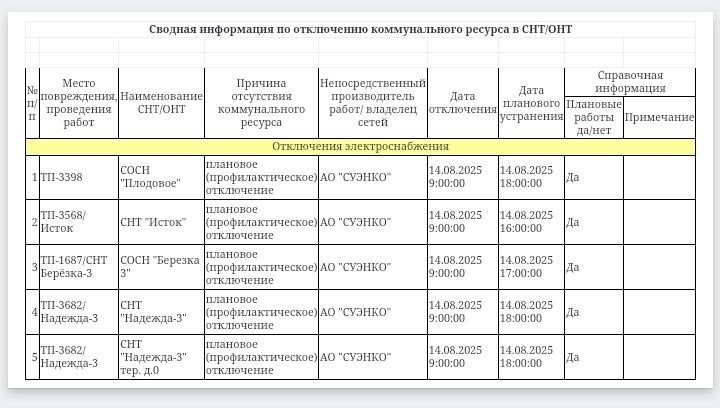 Информация по плановым отключениям в СНТ/ДНТ на 14.08.2025 от ЕДДС города Тюмени