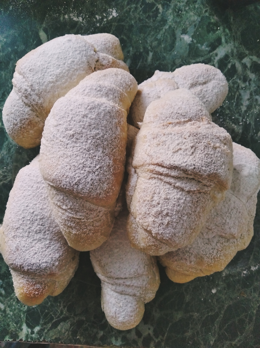 Круассан к завтраку должен быть свежим, с хрустящей корочкой, конечно самый вкусный круассан испечен своими руками. Состав: -мука-600г. -вода-170г. -сахар-100г. -сливочное масло-150г. -яйцо-3ш. -дрожжи-20г. -ваниль-1г. Дрожжи распускаем в тёплой воде, растворяем сахар, щепотку соли,ванилин,100г.муки и оставляем на полчаса в тёплом месте прикрыв полотенцем. Закваска запузырится, значит дрожжи начали работать, разбиваем яйца, смешиваем, засыпаем ещё 400г.муки,замешиваем тесто и оставляем для подъёма. Поднявшееся тесто выкладываем на стол, посыпанный оставшейся мукой. Тесто раскатываем в пласт. смазываем пласт маслом, комнатной температуры, складываем с краёв в середину, тесто переворачиваем, раскатываем в пласт, смазываем маслом и складываем снова и так повторяем 3 раза, затем оставляем для подъёма ещё на час. Тесто раскатываем в пласт и режем на треугольники. скручиваем круассаны, укладываем на противень и оставляем для подъёма ещё на полчаса. Выпекаем круассаны при 180 градусах 25-30ми