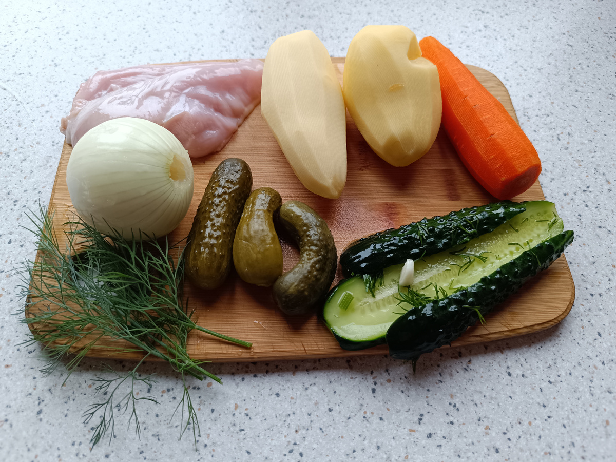 Иногда хочется приготовить что-то быстрое и чтобы было вкусно. Нас всегда выручает такой рецепт салатика. Нам понадобятся следующие ингредиенты: -Филе грудки -Две картошки -Морковь -Солёные огурцы -Лук , укроп -Майонез -Для маринада лука : 9% уксус, соль, перец,укроп, куриный бульон Для начала отвариваем куриное филе, в воду добавляем щепотку соли . Готовый сваренный бульон оставляем для маринада лука. Теперь нужно подготовить лук: нарезаем его мелко вместе с укропом и отправляем в глубокую тарелку, солим и перчим по щепотке (каждого по щепотке). Затем добавляем столовую ложку 9% уксуса и заливаем бульоном от курицы, даём постоять минут 10. Отваренную картошку с морковью нарезаем на кубики или на кружочки, и дольки, и пропускаем через сито для яиц, кому как будет удобно (моя жена делает наоборот - предварительно нарезает картофель и морковь на мелкие кубики, а затем отваривает). Лук, спустя 10 минут, процеживаем от бульона. Мы это делали через обычное сито. Солены