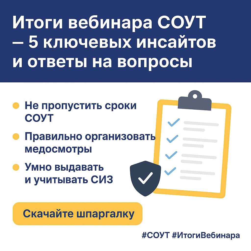 🎯 СОУТ: 3 главных инсайта с вебинара и как избежать штрафов На вебинаре мы разобрали реальные кейсы проверок ГИТ и нашли ключевые точки, где бизнес теряет деньги. 1️⃣ Миф «нас не проверят» опасен Даже небольшие компании получают штрафы до 500 000 ₽. Решение — реестр рабочих мест и напоминания о сроках (4,5 года — пора планировать). 2️⃣ ТОП-3 ошибок по СОУТ — Просрочка — Отсутствие подписей сотрудников — Нет локального акта Каждая ошибка — отдельный штраф. Спасает чек-лист и шаблон документов. 3️⃣ Медосмотры — 74% всех штрафов Частые причины: не направили вовремя, пропустили периодику, нет нужных врачей. Штраф за допуск без медосмотра — до 130 000 ₽ на работника. 📼 Смотрите запись вебинара 📄 Скачайте шпаргалку #СОУТ #ИтогиВебинара