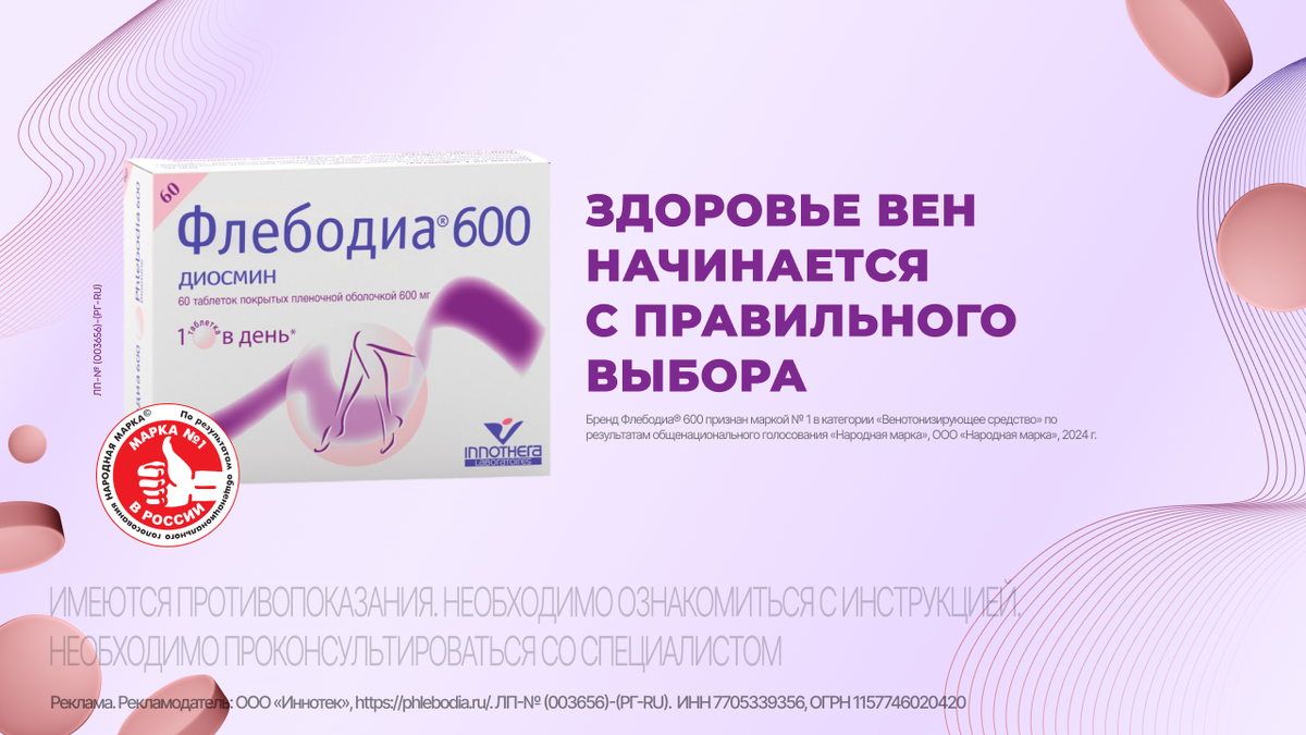 Признание качества: Флебодиа® 600 признан Маркой №1 в категории «Венотонизирующее средство» по результатам общенационального голосования «Народная марка» в 2024 году.