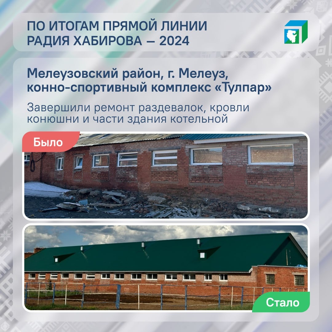 «Помогите завершить ремонт, без вашей помощи нам не обойтись!» С такой просьбой сотрудники конно-спортивного комплекса «Тулпар» обратились на Прямую линию Радия Хабирова в декабре 2024 года. Видеообращение попало в ЦУР Башкортостана. Министерство спорта Башкортостана и администрация Мелеузовского района взяли инцидент в работу. Весной 2025 года средства на завершение ремонта конно-спортивного комплекса поступили, началась работа. В августе отремонтировали кровлю конюшни и части здания котельной. По проекту «Реальные дела» партии «Единая Россия» отремонтировали детские раздевалки и санузлы. Капитальный ремонт конно-спортивного комплекса будет продолжен и в следующем году. Планируют отремонтировать маточное отделение конюшни на 42 конеместа. Проектно-сметная документация составлена и проходит экспертизу. Напомним, что глава региона дал поручение провести капитальный ремонт конно-спортивного комплекса на фестивале «Башҡорт аты» в 2022 году. В «Тулпаре» занимаются ребята из Мелеузовског