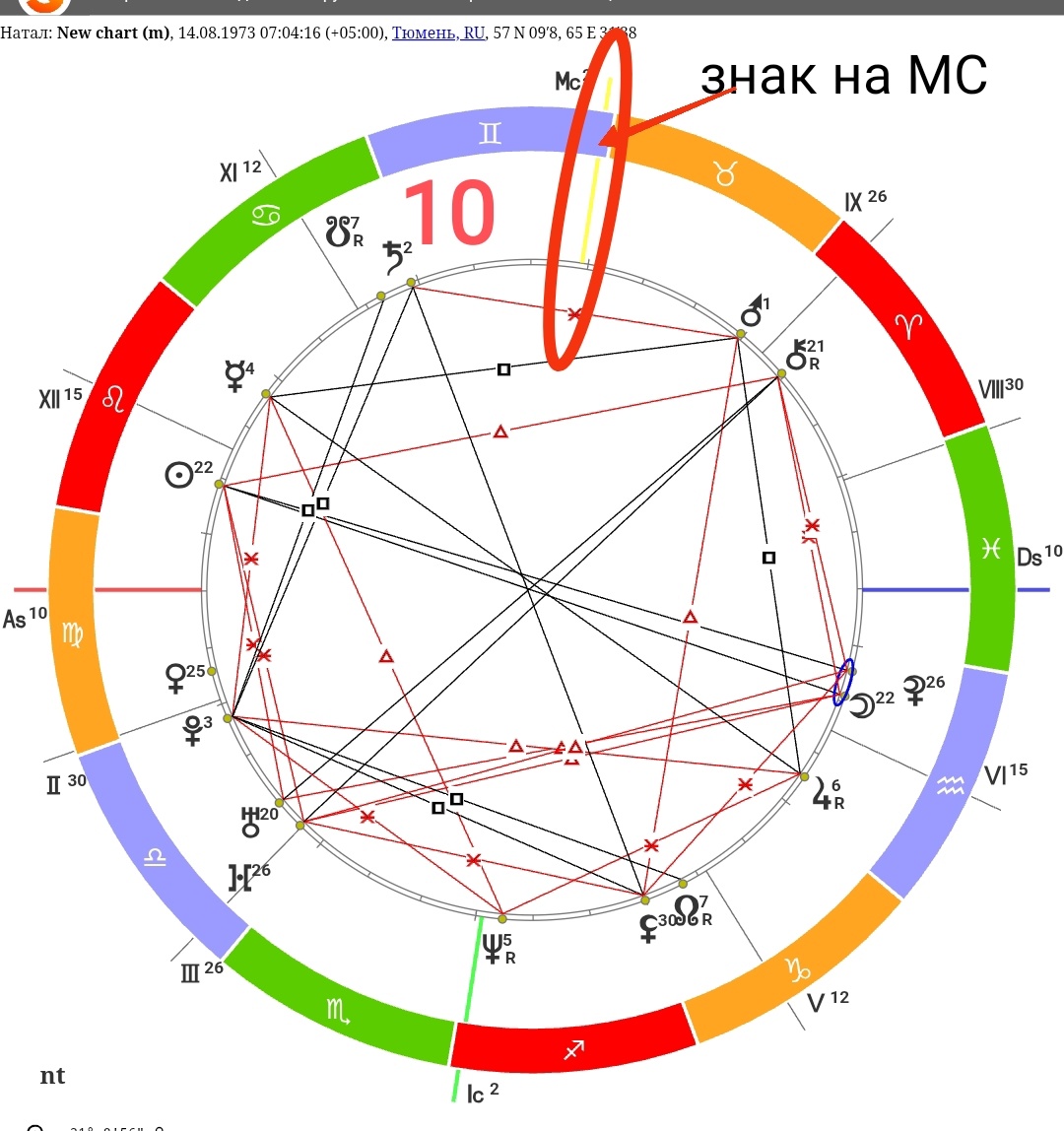 Здесь ничего сложного нет, ведь в карте написано расположение МС. В данном примере мы видим, что МС расположено в знаке Близнецов.