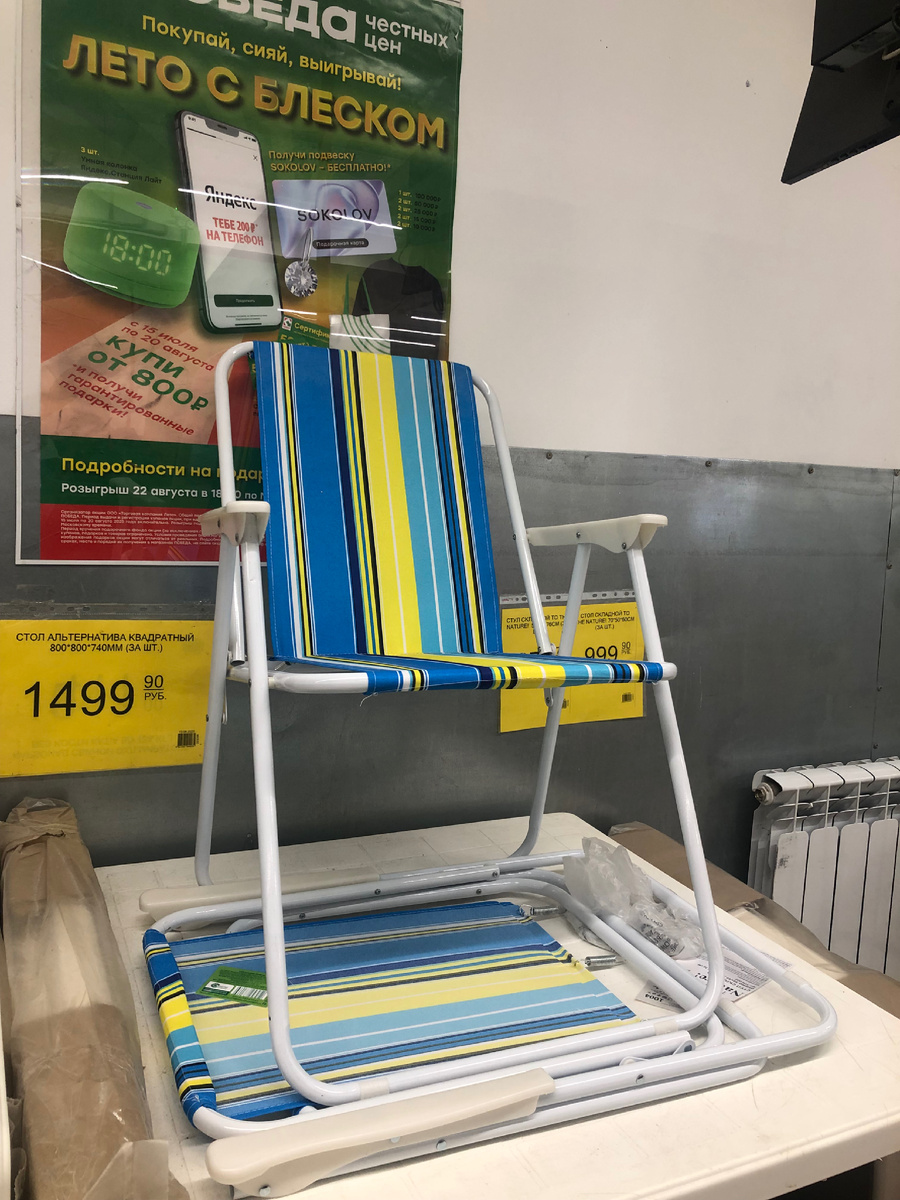У него стальной каркас, устойчивое основание, удобная спинка и легкий вес. Компактное складывание, это очень удобно. В машине он не займет много места. Цена 1077 рублей.