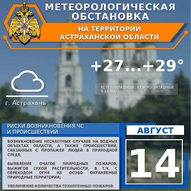 🌐Метеорологическая обстановка на 14 августа На территории области переменная облачность.☁️ Без существенных осадков. Ветер западный, северо-западный 9-14 м/с. 🌡Температура воздуха +26...+31°. 🌥По г. Астрахань переменная облачность. Без существенных осадков. Ветер западный, северо-западный 9-14 м/с. 🌡Температура воздуха +27...+29°.