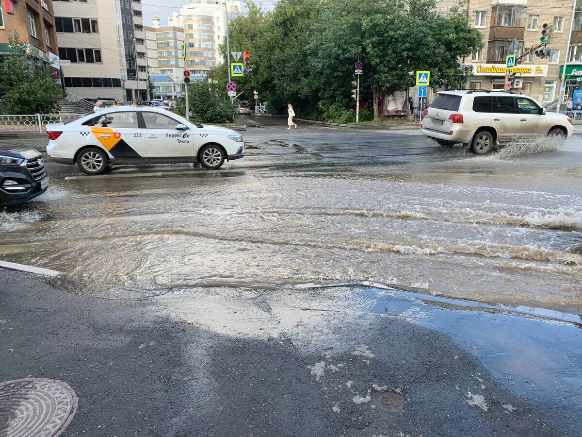 🚰 Глобальный потоп в центре Екатеринбурга на Шарташской-Луначарского-Кузнечной. Прохожие шутят об остатках вчерашнего ливня, но больше похоже на коммунальную аварию.