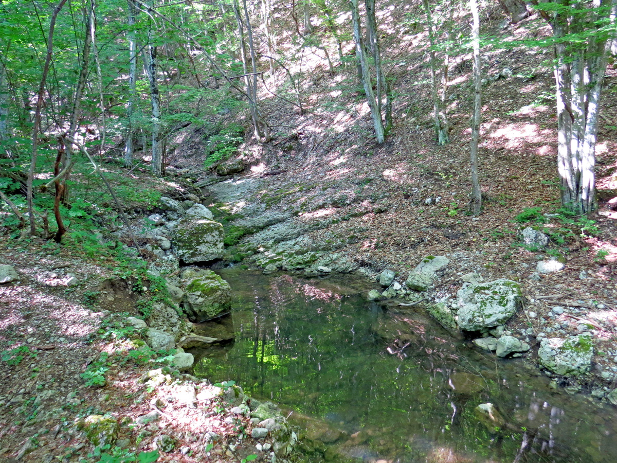 По Суату идет очень комфортная тропа. В меру ровная, можно сказать - прогулочная. Она не забирается ни на какие высоты. Просто идешь и наслаждаешься окружающей природой. На ландыши этой весной мы успели приехать в эти места. Но их зеленные листики еще в начале июня весело стояли вдоль троп. Воды, конечно совсем мало, но я задерживаюсь у каждой небольшой ванночки. Я же люблю отражения! И все равно, в каком объеме воды они отражаются! Вокруг поднимаются довольно крутые склоны. Со всех сторон раздаются трели птиц. Деревья еще яркая свежая листва. Слабый ветерок лениво колышет молодые веточки, поблескивающие в лучах солнца. Эх! Хорошо- то как! Дошли до интересного места, где видно, как скальные слои сложены друг на друга, как река промыла их, создавая водопады. Но, сегодня падать не чему. Лишь только маленькая струйка стекает по камню, оставляя только мокрый след. Остановились на одном из поворотов. Здесь вода промыла огромный полукруг. У меня мечта увидеть здесь водопад! Обычно, в э
