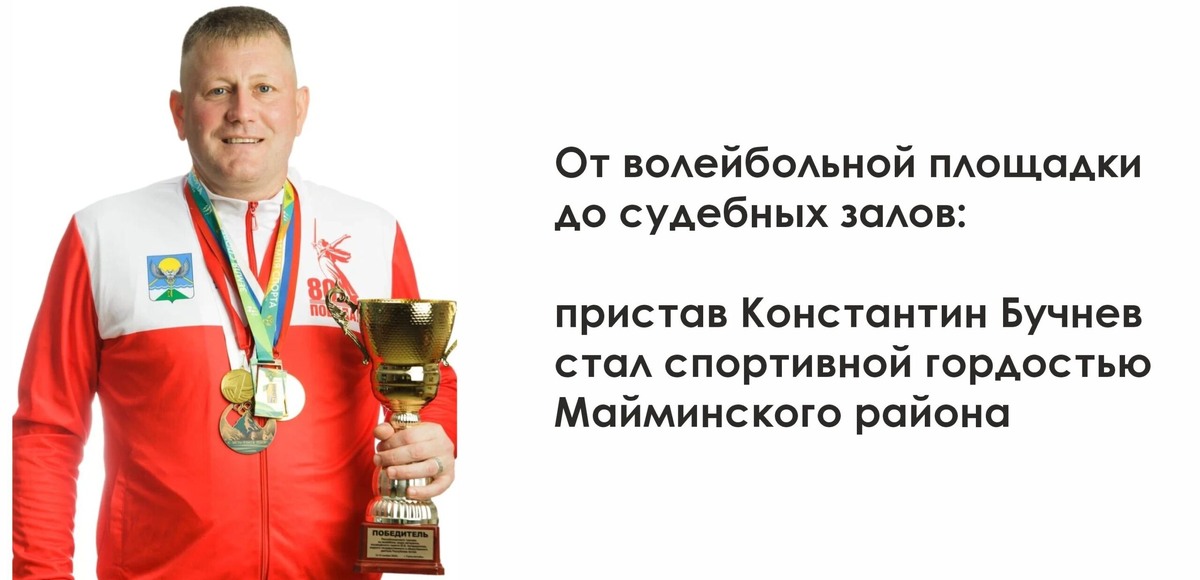 Константин Бучнев, младший судебный пристав специализированного отделения по обеспечению установленного порядка деятельности судов УФССП России по Республике Алтай, младший лейтенант внутренней службы занесен на Доску почета «Спортивная гордость Майминского района». Константин Васильевич начал увлекаться спортом со школы и в дальнейшем поступил на физкультурное отделение Горно-Алтайского педагогического колледжа. Особых успехов добился в волейболе. Принимал участие в соревнованиях различного уровня, в том числе международных, неоднократно был признан лучшим игроком в команде. После службы в армии продолжил профессионально заниматься волейболом, играл за силовые ведомства, стал членом сборной Сибирского федерального округа. В 2007 году поступил на службу в УФССП России по Республике Алтай. Наш коллега не только профессионально и добросовестно выполняет свои обязанности по обеспечению безопасности и порядка в судах, но и принимал участие в ведомственных спортивных соревнованиях по служеб